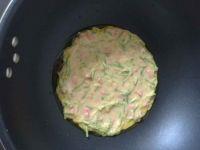 5.平底锅放适量油,放一大勺面糊,均匀摊开,总共可以摊三片这样大小的饼