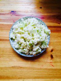 1.花菜用刀切成小粒,然后用淡盐水泡20分钟捞出备用。