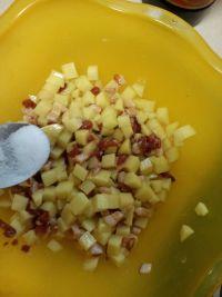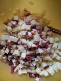 2.土豆去皮洗净切成小丁用清水冲两边,控水后加入盐腌一会腌出水分,挤干水分。