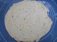 8.将有葱油的一面朝上立起来,一边抻一边卷