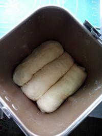 2.将牛奶鸡蛋倒入面包桶,一角放入糖,另一角放入盐,加入面粉,最上面放酵母,开始揉面程序。
