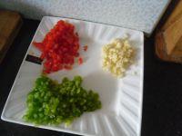 2. 把配料青红椒洗净切粒、蒜切粒备用