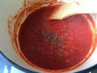 15.再将西红柿汁和糖倒入锅中,加3g盐煮至汤汁较为浓稠时放点罗勒碎炒拌片刻