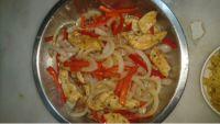 1.准备食材,鸡肉(可用鸡腿,鸡肉肉)切丝,用油,盐,黑胡椒拌匀腌半小时。红辣椒去籽切丝,胡萝卜切丝,洋葱切丝,葱段,咖喱块切碎。