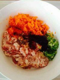 2.猪肉剁细腻泥,胡萝卜剁细绒。葱切碎葱花,姜切碎末。