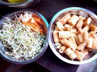 2.准备食材:将油条切成小段,自发绿豆芽去除根部
