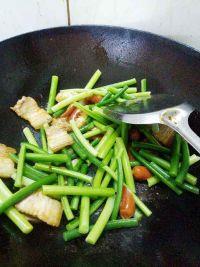 6.然后倒入蒜薹炒至断生加入少许盐调味即可